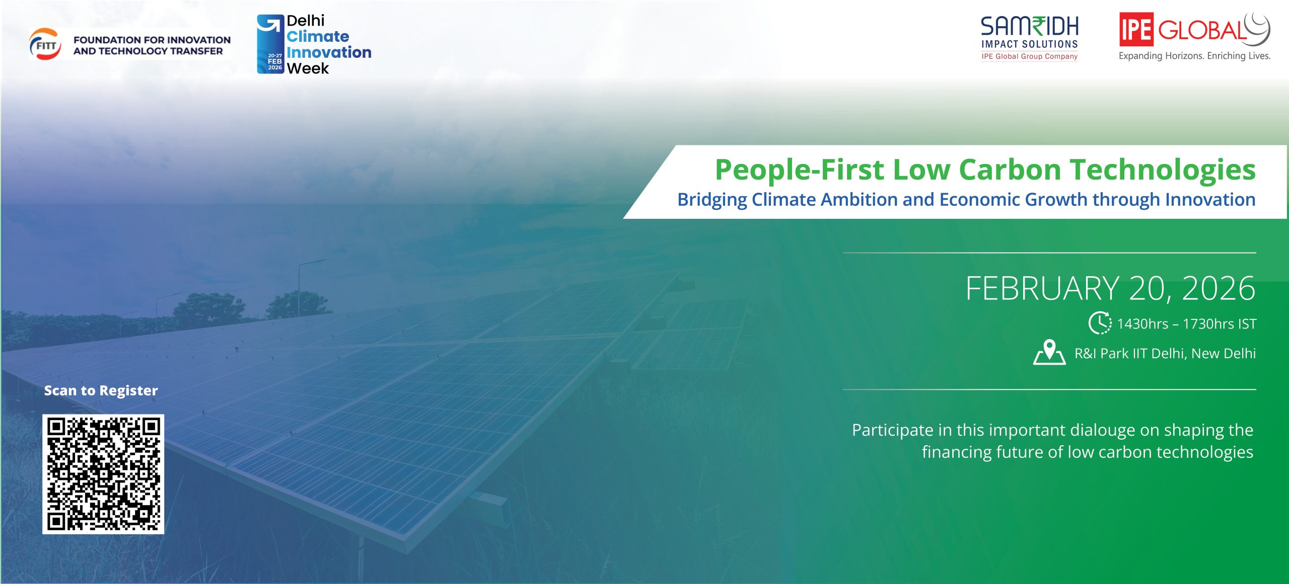 In the inaugural edition of Delhi Climate Innovation Week 2026, IPE Global and SAMRIDH Impact Solutions Pvt. Ltd. (SISPL) are proud to host a national dialogue titled “People-First Low Carbon Technologies: Bridging Climate Ambition and Economic Growth.” This session aligns with the People-Centric Climate Innovation and Just Transitions theme of Delhi Climate Innovation Week 2026, reflecting the growing recognition that climate solutions must deliver tangible social and economic benefits alongside emissions reduction. As India accelerates its climate ambition, the success of the low-carbon transition will depend not only on technological advancement but on how these technologies are designed, financed, and deployed to serve people, livelihoods, and communities.